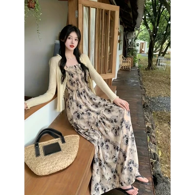 エレガントな花柄オフショルマキシドレス - 2025年夏コレクション、ハイウエスト、スリム効果、ストローハット付きのラジスタイル、女性ファッション