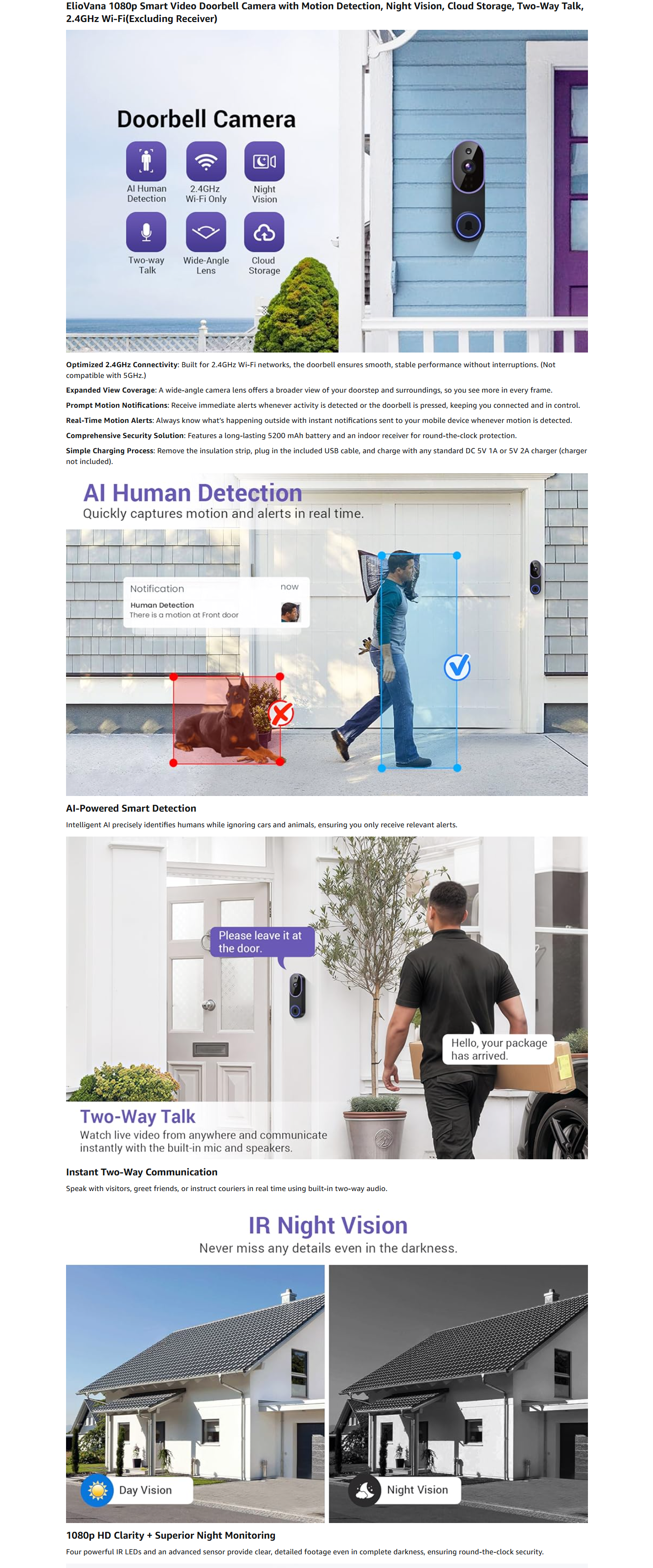 1080P Smart Video Doorbell Camera with Motion Detection, Night Vision, Cloud Storage, Two-Way Talk, Battery Powered, Home or Business Security